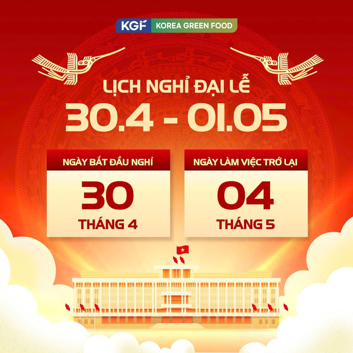 Căn cứ theo quy định của Nhà nước về chế độ nghỉ lễ, KGF xin trân trọng thông báo lịch nghỉ lễ Đại lễ 30/04 và 01/05 năm nay cụ thể như sau: